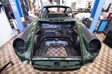 Először 2021 júliusában ámultam el, milyen profin halad a munka annak ellenére, hogy a sorrendiséghez nem volt még meg a rutin, így pedig inkább a gombhoz kabátot elv érvényesült. Startup ez, ám bármilyen idegőrlő és költséges lehetett eljutni eddig a pontig, a KAMM valószínűleg a jövőben is tesztelésre használt prototípusán egyedül az autó váza, a tető és a hátsó sárvédők maradtak eredetiek, minden egyéb a legmagasabb minőségű szénszálas kompozit. A KAMM még saját kemencét is épített, hogy a legtöbb karbon alkatrészt gond nélkül előállíthassa. A részletek legyűgözőek, pedig még nem is végleges a 912C minden eleme.