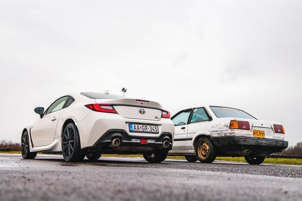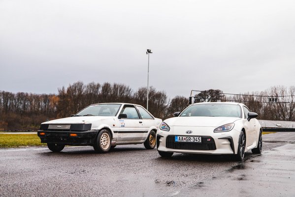 Két napig sem volt nálam az autó, két napig szakadt az eső, ezért kerítettünk rá egy pár Linglong hátsó gumit, és elmentünk driftelni, zárt pályára. Érdekes egybeesés, hogy az első drift élményem is egy Toyotához kötődik, csak az egy AE86-os Corolla GT volt, vagyis Hachiroku. Az autó Shitgun néven fut, ami remekül leírja, hogy mi mindenen ment keresztül: Karotta vette még, hogy a szép Hacsijához legyen donor, majd Vályi Pista és Stump Bandi ásta ki a földből, hogy drifteljenek vele, a GR86 forgatásra pedig Csipszer Máté és Bandi hozta el. Az elmúlt lassan negyven év, néhány gumifal és légköri oxigén is hagyott rajta nyomot, de a hajtáslánc erős, egészséges, és ugyanúgy megy keresztbe, mint a GR86.