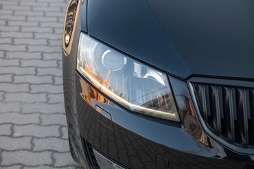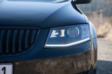Kívülről az első fényszóró a leglátványosabb extra: ez a LED-es menetfényét alul hordja, fekete hátteres és bi-xenon. A mattfekete rács és a hozzá illő, szintén mattfekete embléma utólagosak, de kétségkívül nagyon jól állnak az Octaviának, a metálfekete színnel együtt kimondottan morcos így az autó eleje. Szerencsére ez még facelift előtti, szóval nem csapja agyon az orr fazonját a bután kettévágott fényszóró.
