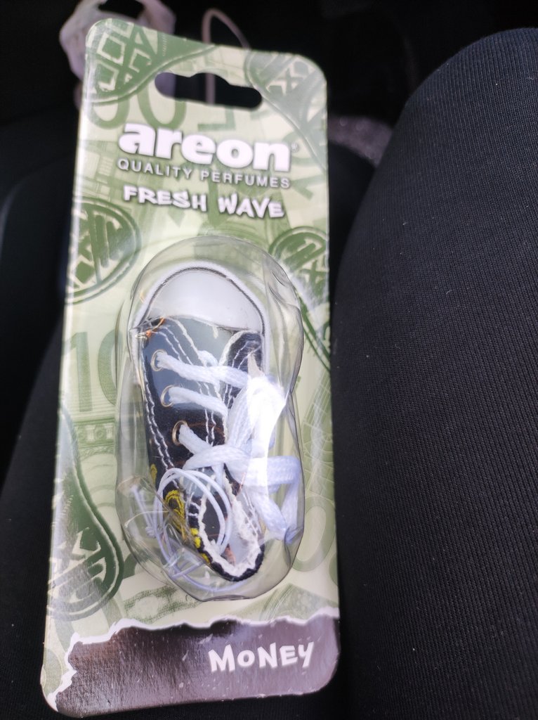 Milyen szaga van a pénznek? Na és egy kínai tornacipőnek? Csak azért vettem, hogy fény derüljön a pénzszagú illatosító titkára, de olcsó fertőtlenítő lett belőle. Nem sikerült megfejtenem, a kettőnek mi köze van egymáshoz, bár kabalának egészen aranyos a dolláros (filléres) cipő. Illatilag körülbelül teljesen jellegtelen légfrissítő-tisztítószer, egy kicsit visszahozza a covidos időkben minden közhivatalban terjengő illatosított fertőtlenítőszagot, nem nagyon zavaró, de kellemesnek sem igazán mondható. Egyre erősödik az érzésem, hogy a tükörre akasztható illatosítók a kibontás utáni első néhány órában nagyjából kiadják magukból a maximumot, utána jelentősen enyhülnek, csak valami utóillatot érezni, bár ezesetben ez nem is baj.
