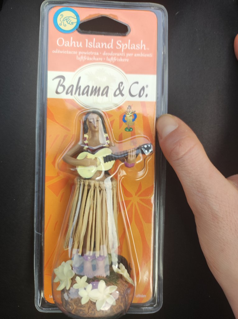 Igazából amennyire vártam ezt az csodálatosan ízléstelen, műszerfalra ragasztható miniszobrot, annyira csalódtam a nagyon halvány kókuszos-általános műgyümölcsös illatban, ami gyakorlatilag a felbontás után tíz perccel teljesen meg is szűnt. Még abban reménykedtem, hogy a fűszoknyás Hawaii/Bahamák/tetszőleges nagyon messzi és egzotikus sziget - életérzést megidézni hivatott táncosnő az autó mozgásával szinkronban rázni is fogja a fűszoknyát, a bólogató kutyát megszégyenítő mozgáskultúrával, de semmi, áll a műszerfalon, mint a cövek, és az illatot sem nagyon szolgálja. Kivétel nélkül minden tanulóm azt állította, hogy semmit nem érez. Látványra legalább igazán több volt az eddigieknél, de elvileg illatosítókat akartam tesztelni, nem porcelán nippeket. Ha átalmatlanul aranyos, vitrinbe való porcelánfigurát szeretnétek venni a kocsiba, arra jó lehet, de ha illatosítót, arra sajnos nem. Van azért benne némi Zsigulitaxi-életérzés, szavannák, fekete nők, nem igaz, Janikám? Höhöhö, érted.