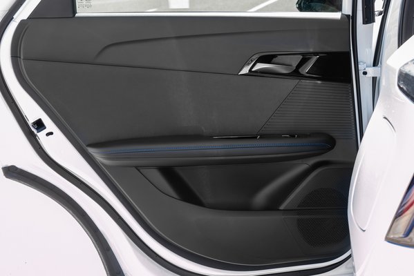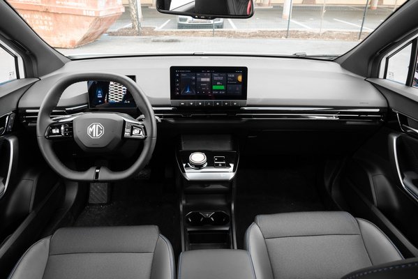 Az utastér megszilárdult kőolajszármazékok ízléses variációja némi varrott!! kék cérnával. Akadnak sima műanyagok, texturált műanyagok, zongorlakk műanyagok, kemény műanyagok, puhák és némi linóleum jellegű vegán bőr. Nem mondom, hogy nincs szintetikus diszkó hangulata, de cseppet sem rosszabb, mint a hasonló kategóriás mainstream típusokban. Van rendes fejtér, ami manapság a kupésítás évtizedében abszolút nem divat, ráadásul magasabbra kell ülni, mint a Model 3-ban. A lábtérre - vagyis hiányára - viszont sokan panaszkodtak mögöttem (184 cm. vagyok), és ez nem csoda, az MG4 egy kicsi autó.