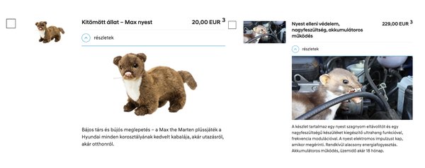A német Hyundai Ioniq konfigurátorát tovább böngészve lettem figyelmes a koreaiak nyestszeretetére. Hátterében azt gyanítom, hogy a német kémek két külön csatornán adták le az infót Szöulnak, miszerint a Bundesrepublikban rajonganak a nyestekért, de fejfájást is okoznak, amikor elrágják az autók kábeleit. A vezetőség döntött: a Hyundai most egyszerre kínál megoldást a nyestrajongóknak, és azoknak is, akik már megjárták velük.