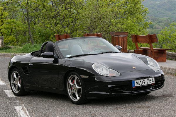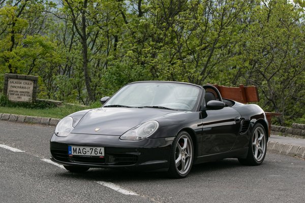Egy ekkora piacra a Porsche is be akart törni, és bár nyilván árban ezekkel nem akart versenyezni, de egy, a 911-nél lényegesen olcsóbb, középmotoros sportautó lett belőle. 1993-ban már volt egy koncepció az első, nem-orrmotoros, de vízhűtéses Porschéből, 1996-ra pedig már gyártásba is került. A Kedvenc kereskedésből elhozott példány már a facelift utáni, 2003-as Boxster S a legerősebb, 3,2-es motorral, de Tiptronic automata váltóval. Kézi váltósként népszerűbb és keresettebb a típus, ami nem véletlen, cserébe viszont ez egy Black Edition, ami nemcsak a fekete külsőt és fekete bőrbelsőt takarja, hanem az ezüst beltéri díszbetéteket is.