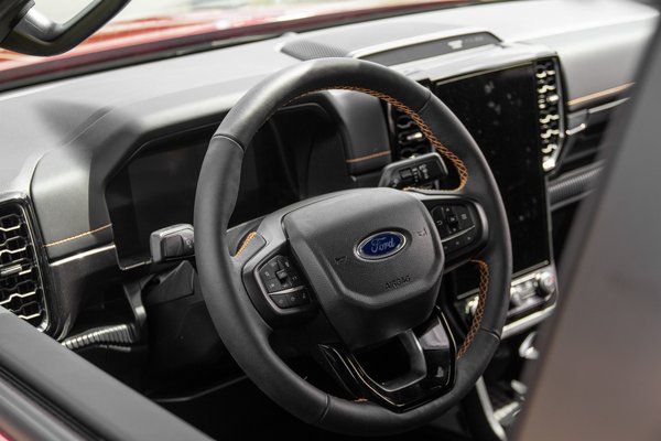 A bőr üléseket és a kormányt sárga varratokkal díszítették ki, ezt a díszítést pedig hátul is folytatták. A műszerfalon a díszvarratok és fényes grafit elemek mellett egy ugyanúgy sárga Wildtrak felirat is helyet kapott, ahogy az ülésekben is, hogy ne felejtsük el, melyik típusban ülünk éppen. Kimondottan tetszett, hogy a levegőrostély mintája a Ranger hűtőrácsához hasonlít.