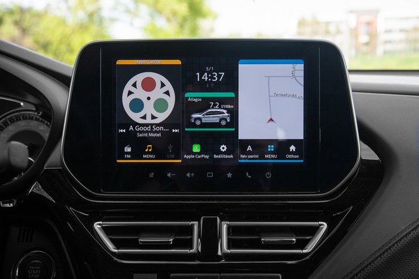 A klímakonzol kezelése teljes mértékben analóg, és a kormányra is jó nyomáspontú, hagyományos gombok jutottak. Az egyetlen összehúzott szemöldök a központi kijelző alatti kis gombok miatt jár, mert azok azon túl, hogy érintősek és kicsik, egy üveglapon vannak magával a központi kijelzővel, így aztán tök esélytelen őket rendesen használni. Itt azonban mák, hogy olyan funkciókat vezérelnek, amik vagy nem kellenek állandóan, vagy meg lehet oldani a kezelésüket máshogy.