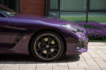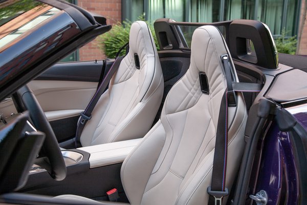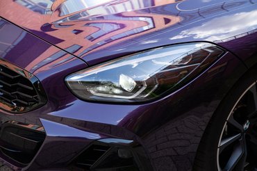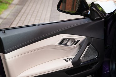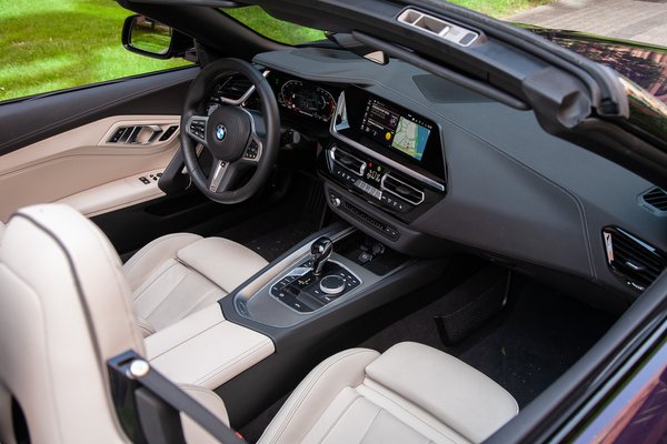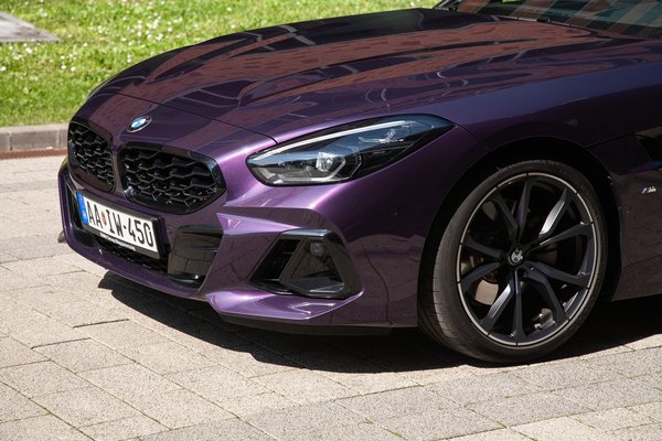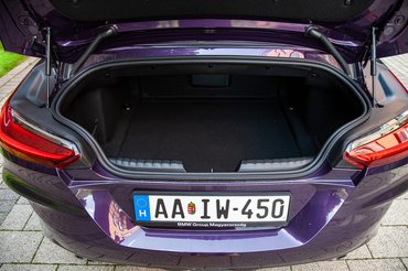 A húsos, mattfekete felnik és a fényes fekete kiegészítők remekül működnek a lila metállal, mindezt pedig szépen kiegészíti a világos bőrbe csomagolt beltér. Utóbbi csak akkor válik az összkép tevőleges kiegészítőjévé, ha megskalpoljuk a Z4-et. A belső különben jóval konzervatívabb, mint a külső: az ülések vonalvezetése elegáns, és úgy általában az egész beltér elég visszafogott. Persze, van állítható színű hangulatvilágítás – lila is lehet! –, meg digitális műszerfal, de nincs úgy túltolva, mint egy modern Merciben.
