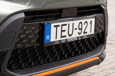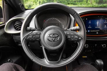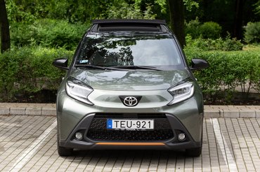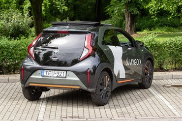 Elvi problémáim akadtak tehát bőven, de igyekeztem félretenni az előítéleteimet. Végül őszinte kíváncsisággal ültem be a tesztautóba a Toyota telephelyén, és be kell valljam, hamar elkapott az Aygo X varázsa. A legdrágább kivitelt kaptam meg: minden benne van, amit bele lehet tenni. A sávtartó vagy az adaptív tempomat helyett azonban mégis olyan apróságok varázsoltak el, mint a belső és külső jópofa színes betétei, vagy a vászontető. Elég megnézni a képeket: kívül a tesztautó három, tökéletesen harmonizáló színben pompázik. Már az alap kardamom zöld kissé olajos árnyalata is piszok jól áll neki, de az egészet a fekete farrész és az itt-ott megvillanó narancssárga betétek teszik teljessé. Ezekből jutott előre, hátra, oldalra, sőt, még a 18 colos fekete felnikre is. Az összkép olyan jópofa, hogy még a hatalmas fehér reklámmatricák sem tudják elrontani.