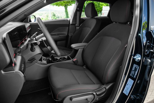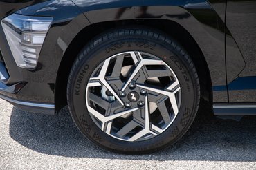 A külső eléggé adja, már csak azért is, mert szerencsére kisimították az előd kicsit bénácska részletmegoldásait. Pofás a kiállása, ügyesek a részletei és jók az arányai. A leglátványosabb részlet az autó orrán keresztben, fénykardként terpeszkedő csíklámpa. Erről néha az agresszív szó jutott eszembe, néha pedig a mérgesen hunyorító Bud Spencer ugrott be róla. A hátsó lámpát is egy darab, Darth Vader fénykardjára hasonlító, piros csíkra cserélték. Ezeket az egyszerű, de bátor lámpamegoldásokat egyébként nem szabad lebecsülni, hiszen adnak egy kis karaktert, egy kis felismerhetőséget a Konának. Az autó oldalára Zorro vágott egy markáns Z-betűt – akárcsak az Ioniq 5-re –, a kerékjárati íveket pedig sokkal hangsúlyosabbra rajzolták.
