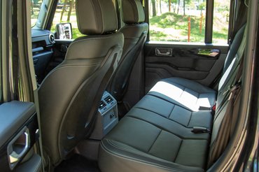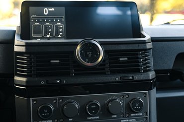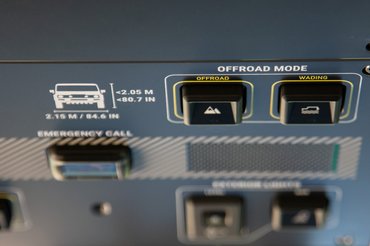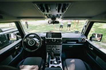 Belül sem átgondolatlan a hangulat. Teljesen vízálló a kabin, nagy, kesztyűben is könnyen kezelhető, gumírozott nyomógombokkal a helikopteres stílusú műszerfalon. Az off-road gomb is a tetőkapcsolók között kapott helyet, mellettük pedig ott vannak a kivehető, kétállású szafari-ablakok is. Középen iránytű, a tisztességes kézifékkar garantáltan nem marad a kezünkben, a kormánykeréken pedig a hírhedt Toot gomb, ha épp egy biciklist szeretnénk figyelmeztetni a három tonna érkezésére.