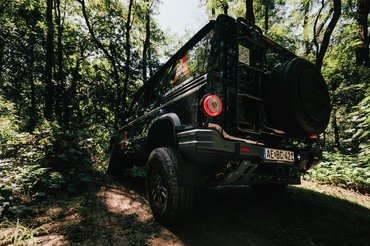 Felezővel, zárt állásban, a nyomatékot szépen adagolva erőlködés nélkül ment előre, a lejtmenet-asszisztens pedig hasonlóan könnyedén tartotta kontroll alatt a jelentős tömeget lefelé is. Minden határozottan és precízen kapcsolt, egyedül a már említett tükrökre és a tető nyitott ablakaira kellett jobban figyelni a szűk földutakon. Előbbi más terepjárókkal is így szokott lenni.