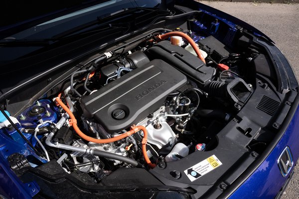 A 181 lóerős rendszerteljesítmény egy 2 literes, négyhengeres motorból és két villanymotorból jön ki, a Hondánál pedig büszkék arra, hogy a CVT-váltós bégetést ki tudták küszöbölni. Ez részben igaz: padlógázon, amikor egyébként tök jól gyorsul a gép, szinte érzed a villámgyorsan elváltott fokozatokat, és a villanyos motorfék megoldása is okos, a kormányon lévő “váltófülekkel” precízen tudod pöcögtetni.