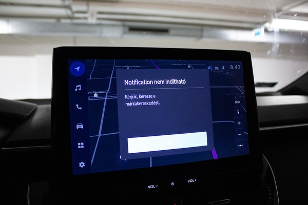 Még bőven a kereskedés egyik munkatársával beszélgettem járó motor mellett, mikor megjelent egy hibaüzenet az infotainment kijelzőn: „Szoftverfrissítés sikertelen. Kérjük, próbálja újra később.” Persze egyből szóltam is mellettem állónak, aki először a fejét vakarta. Az üzenet végül leokézás után eltűnt, majd két perc múlva ismét megjelent. Ezt még eljátszottuk párszor, ugyanezzel az eredménnyel. Kisvártatva egy második hibaüzenet is jelentkezett: „Notification nem indítható. Kérjük, keresse a márkakereskedést.”