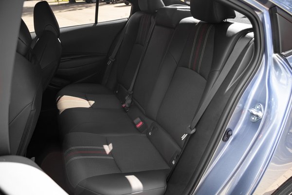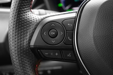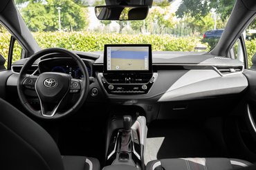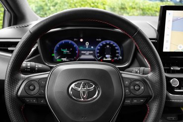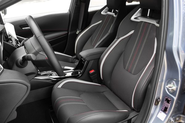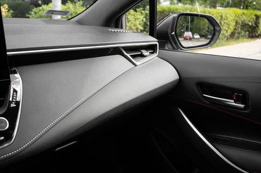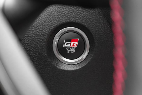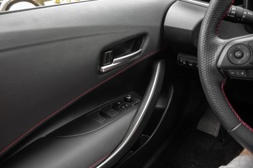 A legtöbb felületet a Toyota tipikus texturált műanyagjának egy puhított változata borítja, kivéve a vezetőoldali ajtó és a kormány között randa kitüremkedést, azt a legrosszabb kopogós műanyag borítja. Az egész műszerfal legerősebb pontja egyértelműen a GR Sport kormány. Tapintása minőségi, fogása kellemes, átmérője és íve pont megfelelő. A minimalista megközelítés az ajtókon is folytatódik, a piros varrás és a GR Sport ülések mentik meg a belsőt az unalomtól. Nemcsak jól mutatnak, de kényelmesek is, az ülőpárna és a háttámla középső része pedig szövetből készült.