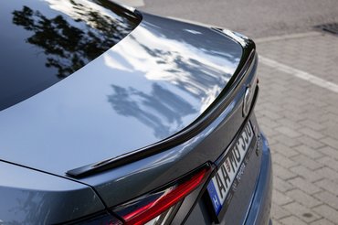 A hörcsögpofát sikerült egész kellemesre hangolni: jók az ívek, jók a formák, de a két alsó sarokba kitolt ködlámpa valahogy nem illik az összképbe. Oldalról nézve kicsit már árnyaltabb a dizájn. A tetővonal dinamikusan folyik a csomagtartóba, kellemes adalék a GR Sport fekete spoilere, jól néz ki a küszöbök fölött végigfutó fekete csík is, de az A oszlop előtt valami nem stimmel: a motorháztető íves vonala nem passzol az egyenes szélvédőhöz, az első túlnyúlás pedig aránytalanul nagy.