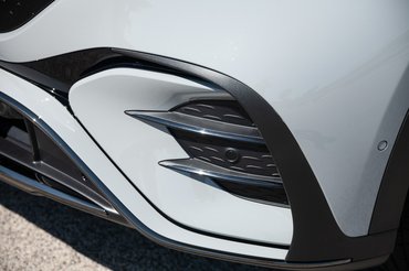 Itt is kiütközik némi kettősség: miközben az alakja miatt hiányzik belőle a németesen marcona kiállás, ezt részletekkel igyekszik némileg pótolni. A kavicsszerű felületbe ívesen belesimuló, belül gyönyörűen kidolgozott első fényszórók például nagyon jól néznek ki, ahogy a volfrámszálra emlékeztető, a hátsó rész teljes egészén átnyúló hátsó lámpákat is eltalálták. Különösen tetszettek a dekorbetéteket viselő, 20 colos – tehát bőven a kisebbek közül való – felnik, amik húsos gumikat hordanak. Az első lökhárító S osztály idéz, szépen hullámzó légbeömlői is jól mutatnak.