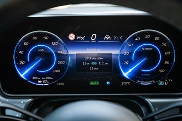 Az akkupakk 89 kWh-s használható kapacitású, amivel a gyártó és a WLTP szerint 541 kilométeres hatótáv érhető el. Az aerodinamikailag végletekig optimalizált EQE SUV alaktényezője 0,25, ami kiemelkedően jó érték, és ez jó hatással van a fogyasztásra is. Annak ellenére, hogy már többször bebizonyosodott, hogy nehéz a lábam, nálam is megállt a fogyasztás 21 kWh-nál száz kilométerenként. Ha kiszámoljuk, ez nagyjából 420 kilométeres hatótávot ad ki, ami ugyan messze van a WLTP értékétől – mi nincs? –, mégse tűnik kevésnek egy ekkora autótól. Más vezényletével jó eséllyel ennél is jobb fogyasztást lehet elérni. Tölteni maximum 170 kilowattal lehet, így 32 perc alatt beletölthető 70 százaléknyi – 10-ről 80 százalékra – dzsúsz.