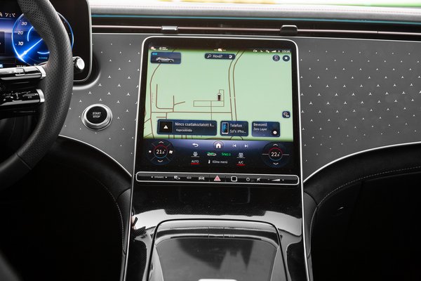 A kijelzők minősége remek: szép a kép, jó a felbontás, és még napfényben is jól láthatók. Ráadásul van mögöttük hardver is: minden flottul, gyorsan pörgött, nem voltak akadozások és bosszantó bugok. Az MBUX rendszerre még mindig nem tudtam igazán ráérezni: nem rossz, de még egy picit lehetne egyszerűbb és logikusabb, bár lehet, hogy csak én nem látom át eléggé. Ahogy mindig piros pont jár a fizikai klímagombokért, úgy fekete a hiányukért, most a helyzet az utóbbi. Hatalmas dicséret jár viszont a hangrendszerért, ami a legjobbak között van, amit valaha próbáltam: a milliós extraként kínált Burmester hifi lenyűgöző.