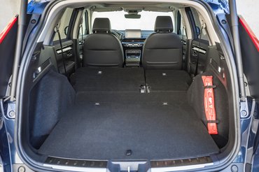 Mivel az akkumulátorok mérete és elhelyezkedése is eltérő a két hibridben, az e:PHEV csomagtere 617 literes, míg az e:HEV 579-587 literrel gazdálkodik attól függően, hogy AWD-e az adott modell. Utóbbi ugyanis lecsíp nyolc liternyi rakodóteret, amit továbbra is könnyen orvosolhatunk a hátsó üléssor ledöntésével. Az új CR-V minden szempontból elég nagy lett.