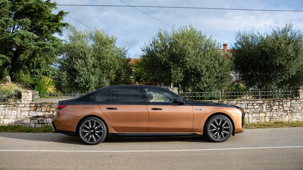 Az tetszik a legjobban, hogy nem akar görcsösen sportos lenni, csak annyira érezzük M-es modellnek, amennyi a javunkra válik. Annyira mozdul el a kényelemtől a dinamizmus felé, hogy hamisítatlan 7-es BMW legyen. Hihetetlen, de mintha a felniméret sem befolyásolná a kényelmet, pedig a 21 colos kerekek alapáron járnak a csúcsmodellhez. A Rolls-Royce-os kisugárzású karosszéria furcsán is nézne ki egy „aprócska“, 17-18 colos szettel, és az alul Liquid Copper, felül Sapphire Black Individual összeállítás a coachline csíkkal szintén a brit irányba viszi el a stílust.