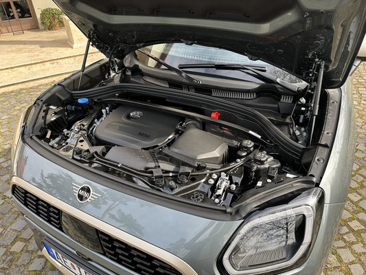 Még mindig sokakban van szkepticizmus a villanyautókkal szemben, de ez a réteg fogyóban van. Viszont amíg lehet, addig a gyártó mindenkit kiszolgál és ezért az 3. generációs Mini Countryman még nem dobja el a teljes motorválasztékot. Plug-in hibrid már nincs, viszont van hagyományos benzines egy 1,5 literes, háromhengeres, 156 lóerős turbómotorral, ami váratlanul nem kellemetlen. Ezen egyébként van egy lágy hibrid rendszer, amivel megvan a 170 lóerő, ám jelenléte inkább a fogyasztásban köszön vissza. A motortér többnyire magában tartja a működés zaját, ám a háromhengeres BMW motor még fordulaton sem emlékeztet egy haldokló kávédarálóra, a JCW pedig egyenesen csúcs.