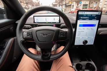 Már a teszt előtt is egész sokat hallottam a Mach-E tulajdonságairól. Jót és rosszat egyaránt, ám mikor egyik utasom a Transitból is ismerős elemeket sorolta, majd az ajtókárpit stabilitását feszegette, finoman tiltakoznom kellett.