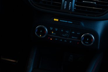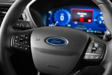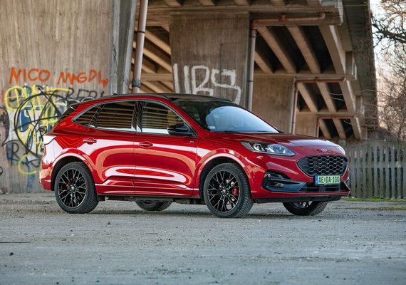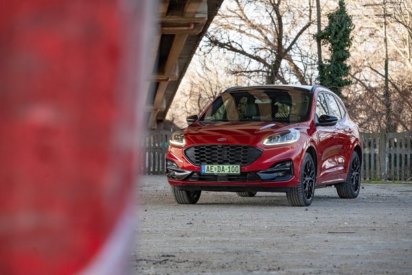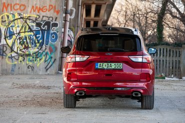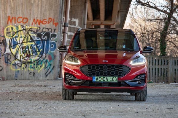 Valószínűleg ez a Lucid Red nevű, 300 ezer forinttal a legmagasabb felárat jelentő szín is teszi, de bárki, aki meglátta, azzal kezdte, hogy mennyire jól néz ki ez a kocsi, és tulajdonképpen nem tudok ebbe belekötni. Lehet mondani rá, hogy ez a Temuról rendelt Aston Martin DBX, mert elölről tényleg feltűnő a hasonlóság, de az Aston-arcú Fordokat immár 10 éve, a Fiesta 7. generációja óta nézegetjük, és egy ilyen autót szerintem kifejezetten feldob: arányos, markáns, szemnek befogadható méretű, jó formájú kocsi ez, az ST-Line felszereltség pedig szintén dob a megjelenésén, bár a 20-as kerekek alatt meghúzódó aprócska fékek komikusan néznek ki, ráadásul a 245/40-es gumikkal zajosan és fájdalmasan pattog alattad a kocsi, úgyhogy én biztos kisebbel kérném, és a sima futóművel.