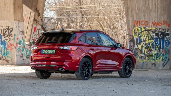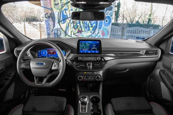 A harmadik Kuga-generáció 2019 óta létezik, ez pedig itt az egyik utolsó darab ebből a szériából, hiszen hamarosan jön a facelift, amit kívülről alaposan átrajzoltak, belül pedig még többet modernizáltak rajta a Sync 4-rendszerrel és egy sokkal nagyobb kijelzővel. Szóval ez még a hagyományos, gomberdős, kizárólag vezetékes CarPlay vagy Android Auto telefontükrözéses, apró kijelzős Ford-rendszer, amit nagyon régóta ismerünk, viszont a forma talán soha nem volt ennyire érett, mint most.
