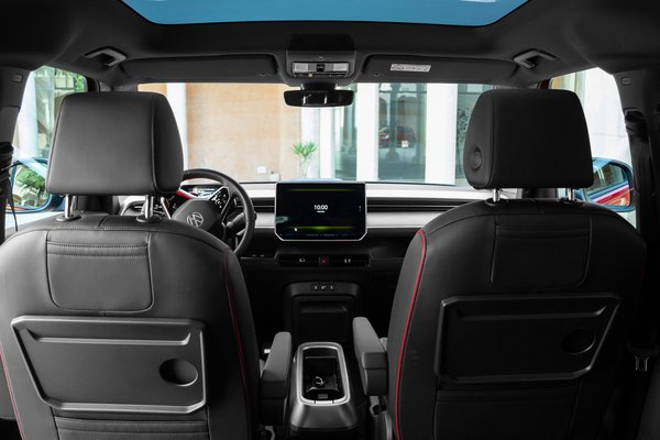 A legszembetűnőbb változás a beltérben, hogy szinte minden fekete, vagy legalábbis nagyon sötét szürke. Hogy azért mégse legyen annyira lélektelen a hangulat, itt-ott szürke fémbetétek, és a GTX szériára jellemző piros varrás töri meg a monotonitást. Az alap ID. Buzz vidám, világos belsejének nyoma sincs - igaz, nem is illett volna a GTX vonal jegyeihez.