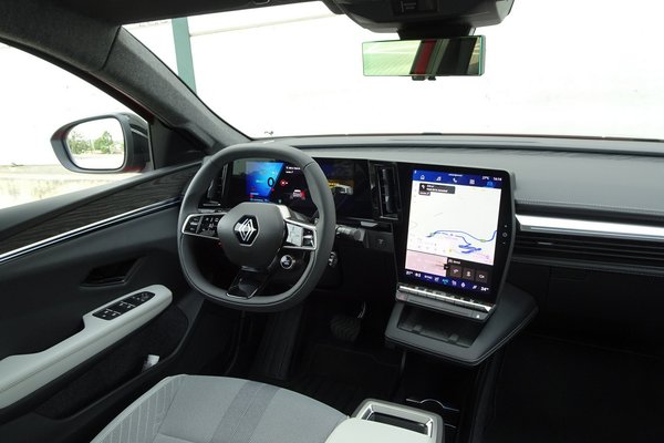 Illik a képbe a 12,3 colos digitális műszeregységből, illetve 12 colos központi kijelzőből álló, szépen integrált multimédiás rendszer, amit még a vezető felé is fordítottak. Ettől még nem tökéletes az ergonómia. Kicsit sok egy oldalon a váltókapcsoló, az ablaktörlő, illetve a távirányító karja. Bármennyire figyelünk, néha úgyis ablakot törlünk majd parkolás közben. Ha már a hibáknál tartunk, a szép és kényelmes könyöklő állítható fedelét rögzíteni kellett volna, mert minden fékezésnél előrecsúszik. Ezek nyilvánvalóan apróságok a Scenic E-Tech fejlesztésében, de jó tippek a frissítéshez.