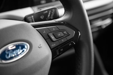 A jégkék mutatók egyértelműen a Fordokat képviselik – a műszerfal nem digitális –, a központi kijelző alatti érintős rész és a kijelzőről vezérelhető klíma viszont a VW hülyesége. Külön korbácsütés jár a kijelzőről vezérelhető ülésfűtésért. Szerencsére az érintőgombok nem vették át teljesen az uralmat: a kormányra jól használható, fizikailag is nyomkodható gombok kerültek, illetve pár egyéb funkció – például szélvédőfűtés – is kapott rendes gombokat.