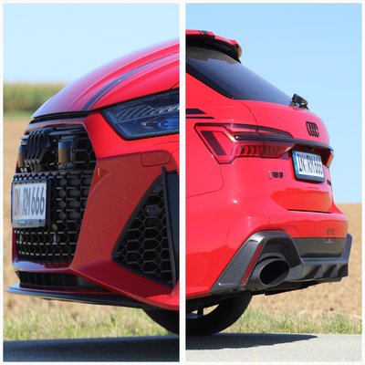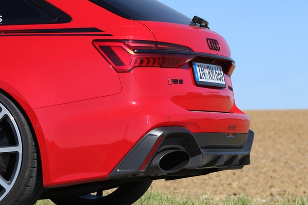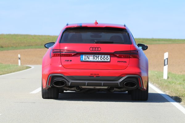 A fékrendszer kerámia, elöl 440, hátul 370 mm a belső hűtésű és lyuggatott tárcsák átmérője. Ez is olyan extra, amik észrevételéhez már ínyencnek kell lenni. Különben nem sokan gondolnák – hogy ha nem veszik észre a számokat az első ajtókon –, hogy ennek a középkategóriás kombinak a négyliteres biturbó V8-asa 1001 lóerős. Még hátul sincsenek extrém kipufogóvégződések, bár a rendszer ugye módosított, de ugyanazokba az oválokba fújja a gázokat, mint a széria RS6-os. Szép, igazi, sportosan rotyogós hangon szól már kis fordulaton is, főleg hátulról hallható ez. Íme: