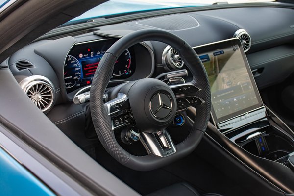 Nem tudok elmenni amellett, hogy az egyébként mesteri arányérzékkel és manapság egyre inkább hiánycikknek számító ízléssel megrajzolt, merem állítani, időtálló szépségű forma nyomokban Porsche 911-et tartalmaz. Ez főleg hátulnézetben, a sárvédő, az oldalablak és az ajtó találkozásánál feltűnő, de a kétmilliós, 21 colos, kovácsolt alumínium felni Techgold árnyalata is ezt erősíti. Összhatásában persze a jól ismert ős-SL stílusát követi modernebb felfogásban. Biztos, hogy a Porschétól is szeretnének vevőket lenyúlni, bár szerintem a két közönség nem ebben a műfajban metszi egymást.