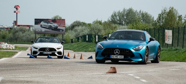 Szerencsém van, hogy a rövid, de annál intenzívebb tesztvezetést az SL-lel kezdhettem, az új roadsterrel már szereztem néhány vegyes tapasztalatot, így számítottam rá, hogy a szűk és technikás, viszont rövid és lassú Driving Camp aszfaltján az 55 4Matic+ változat a 4,0 literes, 476 lóerős biturbó V8-asával, kilencfokozatú automatájával, összkerékhajtásával és -kormányzásával sem érzi majd különösebben komfortosan magát. Persze a 700 Nm jól megindítja majd azon a néhány szakaszon, ahol viszonylag bátran a gázra lehet lépni, de a velem együtt 1950 kilós tömeg önmagáért beszél.