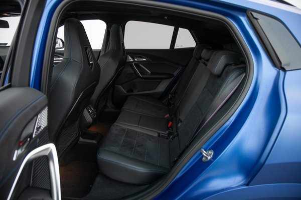 Az anyaghasználat és az összeszerelési minőség is tízpontos: semmi nem nyiszog vagy zörög, és a legtöbb felülethez jó érzés hozzáérni. Az M35i esetében a mokány külsőhöz igazították a belsőt is: vannak remek tártású és jó fazonú sportülések, rengeteg kék cérna és Alcantara. A kormányba még piros színű középjelzőt is integráltak, ami nyilván túlzás, de a hangulathoz tökéletesen illik.