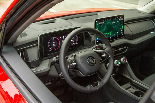 A Sportline kivitelen kívül (abban ugyanis három) kétküllős a Kodiaq kormánya, ami ismerős lehet a többi újabb Skodából. Tekerők, fizikai gombok vannak rajta, fogásra kellemes, ergonomikus, viszont ez a kétküllős kialakítás egy ekkora autóhoz nem feltétlenül illik.