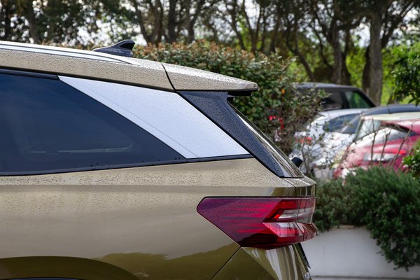 Oldalról teljesen kodiaq-os, talán robusztusabb hatást kelt az éleivel. Újdonság, hogy a D oszlop lehet fekete, vagy Matte Dark Chrome szürke – egyébként ez a szín váltotta csaknem az összes króm kiegészítőt. Alapból 17 colos felnikkel lesz kapható, de 20 col a maximum, amit kérhetünk rá a gyártótól.