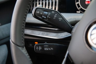 A kormányra szerencsére fizikailag is nyomkodható gombok kerültek, a két oldalt lévő tekerőket a megjelenésük óta kedvelem: parádésan használható megoldás, bár a gombok olcsó hatásúak. Szintén ügyes, hogy a műszerfal alatti, három tekerő közepébe apró kijelzőket integráltak, így mindhárom kezelőszerv adaptív, több funkciót is lehet róluk vezérelni tetszés szerint.
