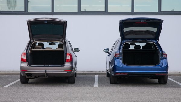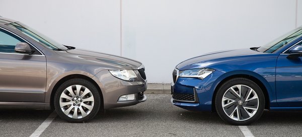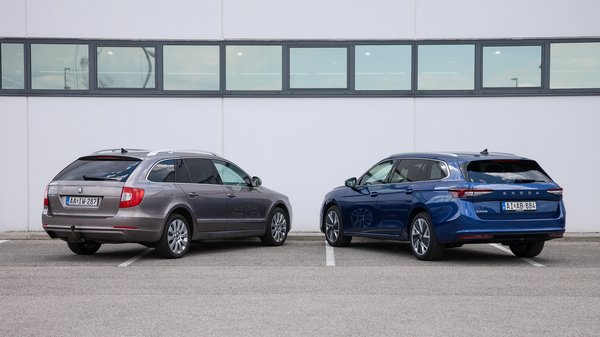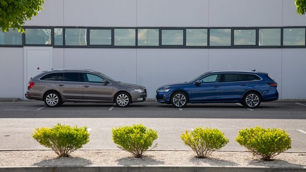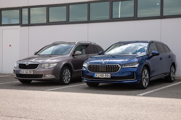 Már messziről látszik, hogy ez a kettő itt igen közeli rokon: nagyon hasonlóak az arányok és a két autó mérete is váratlanul közel van egymáshoz. Utóbbi azért igazán érdekes, mert az autóiparban megszokhattuk, hogy a legtöbb típus a generációváltás után jóval kövérebben tér vissza. Itt valószínűleg azért nem ez a helyzet, mert már a második generációs Superb is akkora volt, mint egy közepes busz, így egyszerűen nem volt értelme érdemben tovább hizlalni.
