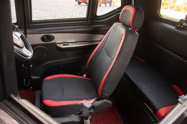 Mivel nagyon keskeny, az ülések középen vannak, egymás mögött, aminek az a váratlan előnye, hogy a sofőr tetszés szerint jobboldalon és baloldalon is kiszállhat. Csepegtettek bele egy kis luxust is: az ablakok elektromosak, van központizár és még Bluetooth-on keresztül is lehet benne nyekergetni a saját zenénket. A Kuba City minden részlete azt kommunikálja, hogy ez valamiféle nagy játékautó: a belső például egy az egyben olyan, mint a gyerekeknek szánt, elektromos kisautóké.