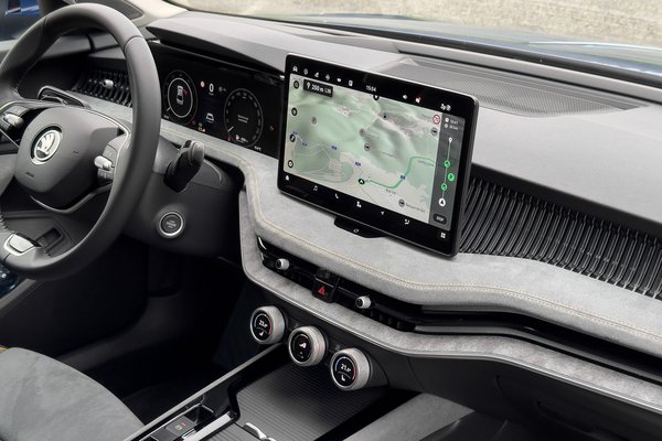Alapvetően szeretem az érintőképernyőre optimalizált autós kezelőfelületet – ha azok gyorsak, jól működnek és átlátható a kezelőfelületük. A Volkswagen-csoport autói ebben jó ideje nem túl erősek, cserébe a Skoda meghagyta a három tekerős klímavezérlőt, kijelzőt épített mindháromba, és ki is bővítette a funkcionalitást, így nem csak hőfokot, ülésfűtést és szellőzést lehet állítani tekeréssel, hanem például menetmódot is választani, ez egy villámgyorsan kezelhető és használható megoldás.