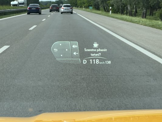 Szegedről hazafele többször is felajánlotta a rendszer, hogy megállhatnánk pihenni, mert úgy érzi, fáradt vagyok. Először elutasítottam, másodjára viszont kíváncsi lettem volna, mit lép, ha okét nyomok. Csakhogy, nem volt oké lehetőség. Ezen jót szórakoztunk, azóta persze kiderült, hogy ha sokáig nyomjuk valamelyik gombot, akkor a pihenőbe navigál, de ez így akkor sem túl sofőrbarát.