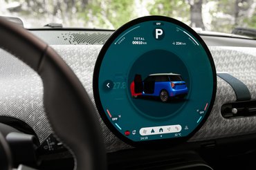 Belül a külsőnél is agresszívebb az egyszerűsítés: eltűnt a kormány mögötti műszeregység, az összes információ egy hatalmas, köralakú OLED kijelzőn jelenik meg, amit a műszerfal közepére raktak. A kijelző alatt található pár apró kezelőszerv, illetve opcionálisan a kormány mögött lehet a head up display. Tulajdonképpen ennyi.