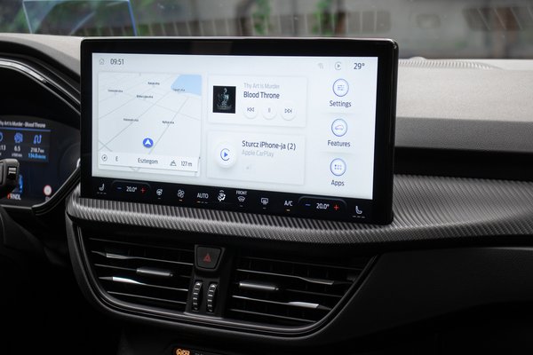 Kicsit alakítottak a beltér elrendezésén, de az olyan alap dolgok, mint a kormány, változatlanul maradtak. Szeretem is ezt a felületet, csak lassan megunom, és vágyok már valami extrára, valami izgalmasabb megfejtésre. A műszercsoport továbbra is digitális, de a rendszer itt is frissült, a kép még tisztább és még átláthatóbb, ezen mindenképpen nyert a Ford.