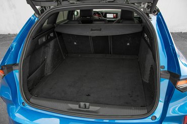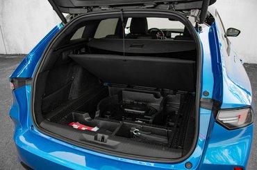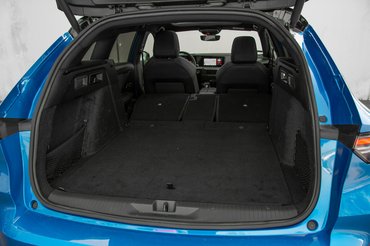 Az 54 kWh-s akkumulátorral felszerelt, tisztán elektromos változattal megegyező padló miatt a hátsó üléseknek csak a támlája dönthető, és az sem teljesen síkba, ettől függetlenül 1634 literesre bővíthető, jól pakolható teret kapunk. A nyílás széles, a holmikat nem kell magasra emelni. A csomagtartó belseje igényesen kárpitozott, a támlák hátulról, karral dönthetők. Bár extra szeparálók nincsenek hozzá, rögzítőhálóval, oldalzsebekkel és padló alatti tárolóval is készültek, a lapot a pakoláshoz egy kampóval rögzíthetjük. Elektromos hátsó ajtót csomagban vehetünk.
