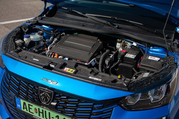 Az első ülés nagyszerű: hosszú távon is váratlanul kényelmes, és oldaltartása is van, közepesen tempós kanyarban sem estem ki az oldalablakon. Ebben a keskeny autóban a hátsó sor továbbra sem tánctér, és bár be tudja hajtogatni magát három tagbaszakadt úriember is, darabra elférnek, de nem jó nekik. A csomagtér alapesetben 265 literes – ugyanakkora, mint a benzineseké – ami az ülések lehajtásával 1,1 köbméteresre bővíthető. Ezek az értékek átlag alattiak ebben a kategóriában. Első csomagtartó sajnos nincs, az E-208 elejét a technika bitorolja.