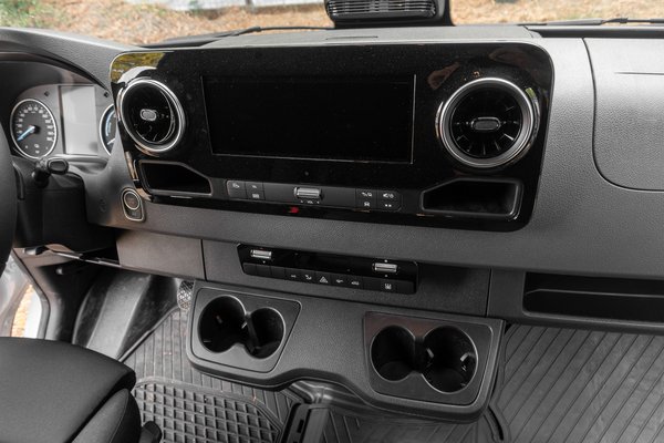 A kormány a Mercedesnél szokásos érintős, amivel én elsőnek az akkor új Sprinter egy elég kívánatos változatában találkoztam. Bár a hagyományos nyomógombosra jobban rááll az ujjam, annyira nem vészes a használata, ami viszont idegesítő, hogy nagyon könnyen el lehet állítani egy véletlen simítással, miközben küzdünk a kormánnyal. A rádió alapmodell volt, hozta amit kell, de ha komolyabb dolgokat (CarPlay, Android Auto) szeretnénk, akkor bizony azt az extra listán keressük.