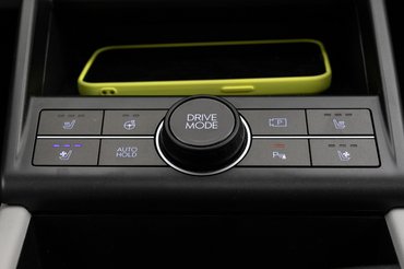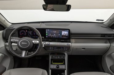 A vezetőnek minden kézre esik, intuitív a gombok elrendezése, amiből rengeteg van. Az ívelt panorámakijelző két 12,3 colos kijelzőből áll, amelyek képe éles, rendszerük gyors, az egy hét alatt egyszer sem okozott kellemetlenséget. A Kona lebegő középkonzolja kisebb túlzással az egyik legjobb, ami ma autóba kapható. Azon kívül, hogy úgy néz ki, mint egy kétezres évekbeli rádióegység, a klímapanel rengeteg gombbal és kis kijelzőjével együtt megmaradt, amik felett gyorsgombok sokaságát fogja közre egy-egy tekerő.
