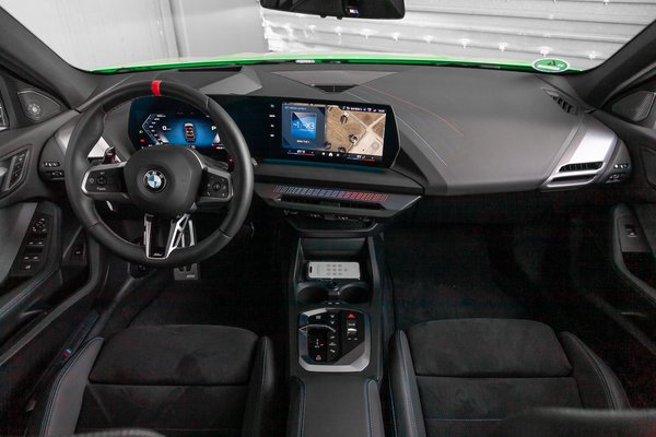 Az 1-es belterét teljesen átszabták, már nyoma sincs benne a BMW régebbi dizájnjának. A műszeregység kijelzője és a központi kijelző ugyanarra a széles, íves lapra került, így a látvány egységesebb. A szellőzőket, a dekorbetéteket és a kisebb látványelemeket az elődhöz képest élesebbre, hangsúlyosabbra rajzolták. Maradt a vezetőközpontú elrendezés: a műszerfal középső részét a sofőr felé fordították. Az összkép gusztusos és jóval szellősebb, egyértelműbb, mint az elődnél, ebben hiba nincs.