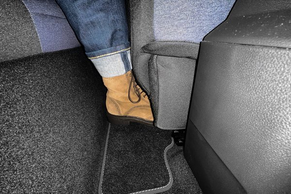 Azért ott, mert még a hagyományosan elég apró államférfiakkal operáló franciák se tudnának hátra egy fél Napoleont se benyomorgatni. Míg a régi R5-ben volt hátul hely, de nem volt hozzá ajtó, itt van ajtó, ami cserébe egy babaházra nyílik. Nem viccelek, annyira nincs lábtér, hogy kizárólag patások ülhetnek hátul, emberszabású lábfejet lehetetlen elhelyezni egy átlagos felnőtt mögött ülve.